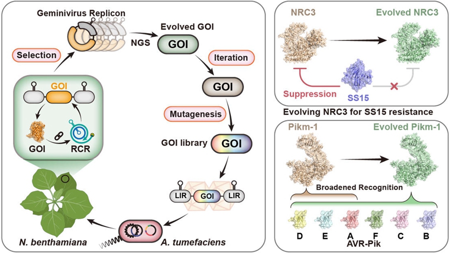 Using GRAPE, the researchers evolved the nucleotide-binding domain leucine-rich repeat-containing (NLR) immune receptor NRC3 to evade inhibition by the nematode effector SPRYSEC15 while preserving its immune activity. Iterative evolution of the rice NLR immune receptor Pikm-1 yielded variants that respond to six alleles of the Magnaporthe oryzae effector AVR-Pik, significantly expanding its recognition range. This strategy yields valuable genetic resources for breeding disease-resistant crops.
