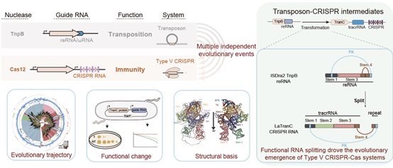 Importantly, engineering experiments confirmed that artificially splitting TnpB’s reRNA was sufficient to convert TnpB into a CRISPR-like system capable of using CRISPR arrays as a source of guide RNAs. These results demonstrate that RNA-level innovation, rather than major protein structural changes, was the primary molecular event driving the origin of Type V CRISPR-Cas systems.