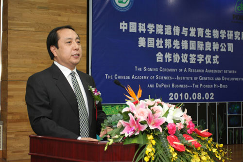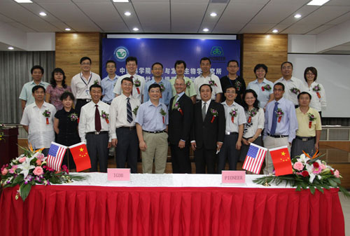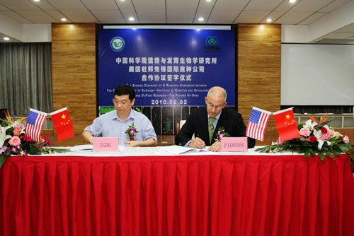 TIME: 02 Aug 2010BEIJING, August 2, 2010 --The Institute of Genetics and Developmental Biology (IGDB) of the Chinese Academy of Sciences (CAS) and Pioneer Hi-Bred, a DuPont business, signed a research agreement today for a collaborative research program of biotechnology and molecular crop breeding in Beijing. Senior leaders from both parties, including Duan Ziyuan, Division Head, Bureau of Bioscience and Biotechnology of CAS, Xue Yongbiao, Director, IGDB of CAS, and William S. Niebur, DuPont Vice President and Country Manager of Pioneer China, attended the signing ceremony.