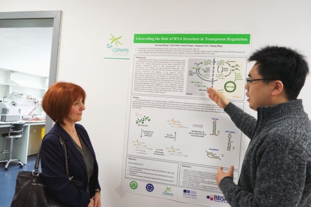 Dr. Jungnam Cho (right), one of the CEPAMS Group Leaders is presenting his joint project to FCO Chief Scientific Adviser, Professor Carole Mundell (left). (Credit: QI Lei)