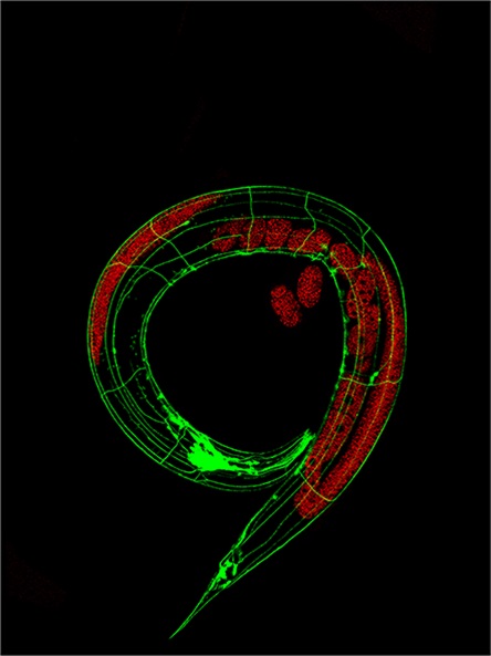 Reconstruction of the nerve system of C. elegans by confocal microscopy. Green corresponds to YFP-labeled neuronal specific marker Q40, and red labels germline specific mitochondrial outer membrane protein TOMM-20::mkate2. Image courtesy of Ye Tian’s lab.