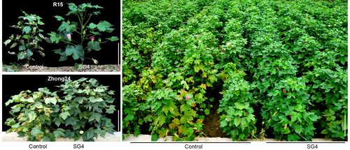 GAFP4 transgenic cotton showed enhanced resistance to Verticillium wilt. R15 and Zhong24 are two upland cotton cultivars. SG4, GAFP4 transgenic cotton. (Image by IGDB)