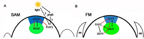 Further study revealed that CLV3, SEPALLATA1 (SEP1), and SEP2 are FHY3 target genes. In SAM, FHY3 directly represses CLV3, which consequently regulates WUS to maintain the stem cell pool. Intriguingly, CLV3 expression did not change significantly in fhy3 and phytochrome B mutants before and after light treatment, indicating that FHY3 and phytochrome B are involved in light-regulated meristem activity. In FM, FHY3 directly represses CLV3, but activates SEP2, to ultimately promote FM determinacy.