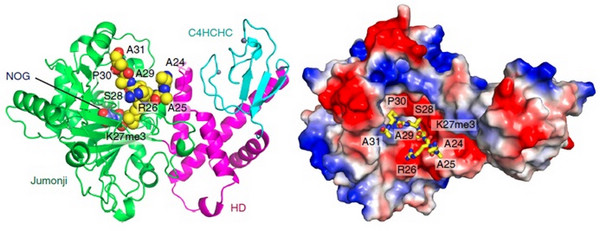 Figure 2. Structures of JMJ13-a-KG and JMJ13-NOG-H3K27me3 complexes. (Image by IGDB)