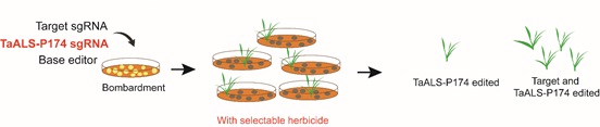 Moreover, they found that base editing at TaALS-P174 endowed wheat with sufficient resistance to nicosulfuron herbicide in MS growth medium to allow selection. When the TaALS-P174 editor was coupled with editors for other targets of interest, co-editing occurred in the nicosulfuron-resistant plants, and selection for resistance in growth medium enriched the frequency of coupled targets by several-fold.