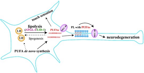 In this study, the researchers found that disturbing lipolysis or enhancing lipogenesis in neurons leads to lipid droplet accumulation in neurons of C. elegans, which is the first time to confirm lipid droplet regulation in neurons in vivo. The ectopic lipid droplets in neurons reduce the normal functions such as touch sensation but increase the ability to defend from hyperactivation-triggered neurodegeneration.