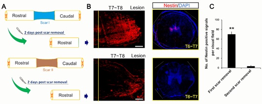 Figure 2. Scar tissue removal activated different amounts of endogenous NSCs in two chronic phases. (A) Schematic illustration of endogenous NSC staining. (B) Nestin antibody staining in adjacent uninjured segments 2 days after the first or second scar tissue removal. (C) Quantitative analysis showed a significant difference in nestin-positive signals in the two chronic phases. (Image by IGDB)