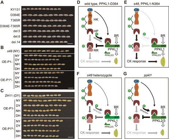 The study showed that a specific amino acid D364 of PPKL1 (Protein Phosphatase with Kelch-Like domains) is most important for the protein function. A specific amino acid D364 resides in a region resembling the receiver domain of RRs, and like RRs, PPKL1 can interact with OsAHP2, one of authentic HPs. Accordingly, PPKL1 can utilize D364 to suppress OsAHP2-to-RRs phosphorelay, whereas mutation of D364 abolishes the effect therefore activates cytokinin response and enlarges grain size.