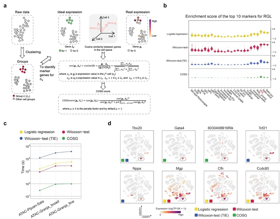 Workflow and benchmark testing results of COSG. (a) Workflow of COSG. (b) Enrichment score comparison of the top 10 marker genes identified by Logistic regression, Wilcoxon-test, Wilcoxon-test (TIE) and COSG for RGL cells. (c) Running time comparison of Logistic regression, Wilcoxon-test, Wilcoxon-test (TIE) and COSG on three scATAC-seq datasets. (d) Expression patterns of the top 3 marker genes for cardiac fibroblasts identified by Logistic regression, Wilcoxon-test, Wilcoxon-test (TIE) and COSG. (Image by IGDB)