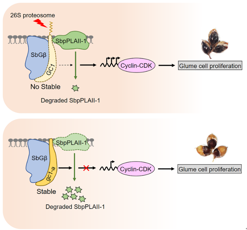 A patatin-related phospholipase SbpPLAII-1 functioning as a positive regulator can promote glume cell proliferation by upregulating the expression of cyclin-CDK-related genes. Compared with GC1, gc1-a, which is more stable in vivo, could promote the degradation of SbpPLAII-1 and then inhibit the function of SbpPLAII-1, resulting in a reduction in sorghum glume coverage.