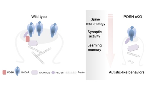 In this study, the researchers found that the scaffold protein POSH clusters at excitatory synapses, together with two other scaffold proteins, PSD95 and SHANK2/3. Mice with brain specific conditional knockout (cKO) of POSH display profound autistic-like behaviors including impairments in social interactions, social communication, repetitive behaviors and deficits in learning and memory.