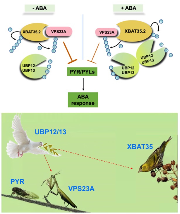 Unexpectedly, in addition to VPS23A, the researchers further found that the E3 ubiquitin ligase XBAT35.2 of VPS23A is also a substrate of UBP12 and UBP13. UBP12 and UBP13 can deubiquitinate and stabilize XBAT35.2 under ABA treatment. Hence, even though UBP12 and UBP13 stabilize VPS23A, they could also promote the degradation of VPS23A under ABA treatment. Altogether, UBP12 and UBP13 are versatile deubiquitinases in ABA signaling.