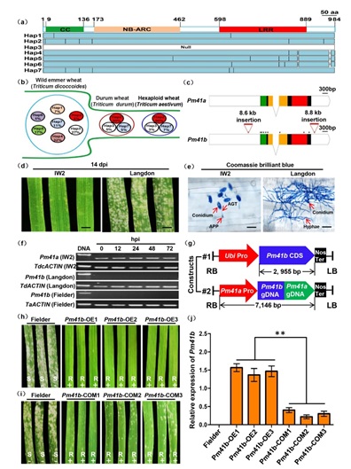 Previously, the research group cloned the powdery mildew resistance gene Pm41 (Pm41a) from wild emmer wheat (WEW), the progenitor of common wheat. Pm41a showed high resistance to more than 80% of the Bgt isolates collected from different natural ecological zones in China. After performing haplotypic analysis, they found 7 haplotypes (Hap1 to Hap7) for the Pm41 locus in the WEW populations. However, only three haplotypes, Hap2 (Pm41b, 90%), Hap3 (Null, 5%) and Hap7 (5%), were identified in durum and hexaploid wheat populations, suggesting loss of genetic diversity of Pm41 locus due to domestication and polyploidization bottleneck. Detailed analysis showed that Hap2, Hap4 to Hap7 carrying two DNA transposons inserted in the promoter and 3′-UTR regions, respectively, but containing an intact Pm41 allelic coding region sequence without expression before or after Bgt isolate inoculation.