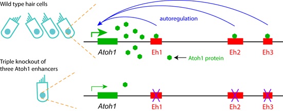 Figure 2. Diagram of Atoh1 autoregulation via three Atoh1 enhancer. In wild type cochlear hair cells, Atoh1 directly binds to three enhancers and autoregulates itself. Triple deletion of three Atoh1 enhancers disrupts the Atoh1 autoregulation, leading to the low level of Atoh1 expression and rare formation of hair cells. (Image by IGDB)