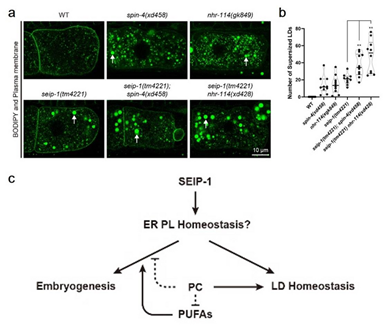 The role of PC, PUFAS and SEIP-1 in the regulation of embryogenesis and lipid droplet homeostasis (PC deficiency enhances the lipid droplet phenotype of seip-1 mutants). (Image by IGDB)