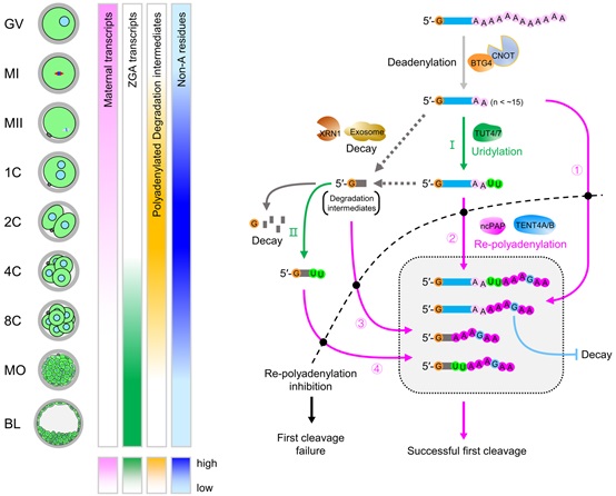 In this study, the researchers found extensive poly(A) tail mediated maternal mRNA remodeling during the human oocyte-to-embryo transition. Unexpectedly, a large proportion of the maternal mRNA undergo partial degradation into their 3’-UTRs, which could be then be modified by incorporation of U residues at their 3’-ends. These transcripts do not go through degradation and can be re-polyadenylated after fertilization, contributing to the production of high level of a new type of mRNA transcripts called polyadenylated degradation intermediates.