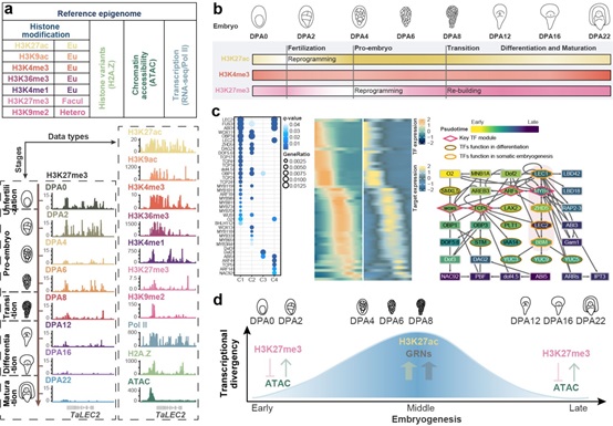 At mid-embryogenesis in wheat, the chromatin accessibility and H3K27ac modification were increased and made a permissive chromatin environment. This chromatin state was helpful to transcription factors binding at the cis-regulatory regions of genes. Based on the cis- and trans-regulation features, the researchers built the gene regulatory networks (GRNs) for embryo pattern, which could facilitate the gene function dissection. At late-embryogenesis, the chromatin was condensed again, with H3K27me3 increasing. The condensed chromatin was also found around the differentiated-related genes, which maintained the silence of the genes. This may be why plants can not go through deeper organogenesis like animals.