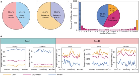 TAD boundaries define the scope of interactions of TADs. In many cases, the variation of TAD boundaries represents the change of gene regulation. The research team also constructed a pan-3D genome of TAD boundaries. Pan-3D genome revealed that TAD boundaries showed a higher level of variation than A/B compartments. Further research revealed that non-LTR retrotransposons (LINE and SINE) were enriched around TAD boundaries, indicating that these two types of elements had important functions in the maintenance of TAD boundary; Besides, Gypsy elements and satellite repeats were enriched around accession-specific TAD boundaries, indicating that these elements play unique roles in the formation of specific TAD boundaries. These results explain how the transposable element (TE) superfamilies reshape the 3D genome in plants for the first time.