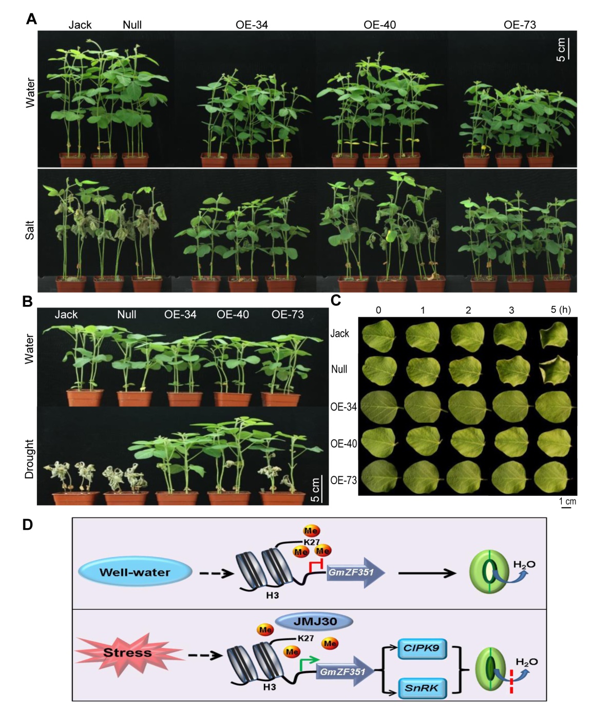 A, Performance of the GmZF351 transgenic plants under salt stress. Jack is the original control cultivar. Null is segregated from heterozygous transgenic plants and without transgene insertion. OE-34/40/73 indicate independent homozygous transgenic lines. B, Performance of the transgenic plants under drought stress. C, Comparison of water loss in detached leaves at different times. D, A working model of GmZF351 in stress response. Under normal well-watered condition, the histones H3K27 is highly methylated at the promoter region of GmZF351, blocking gene expression. Under stress, the histone demethylase JMJ30 is induced and the methylation of H3K27 is reduced, allowing activation of GmZF351 and subsequent downstream gene expression for stomata closure and stress tolerance.
