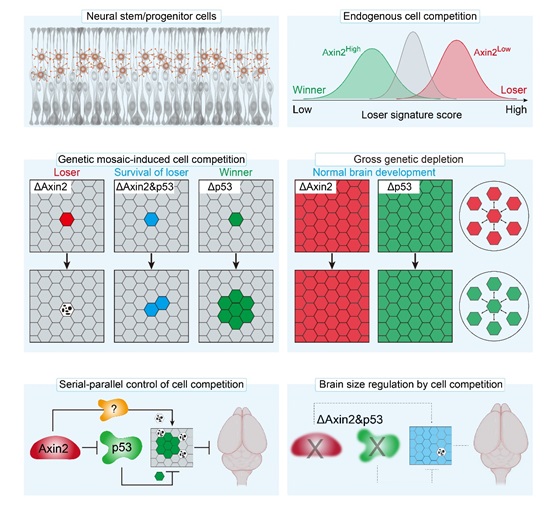 Figure 1. Cell competition between sister neural stem/progenitor cells in mosaic environment. (Image by IGDB)Using this method, they identified two key regulators, Axin2 and p53, which are involved in driving cell-cell competitive interaction. Specifically, Axin2-mutant stem cells were eliminated and even engulfed, whereas p53-deficient stem cells underwent clonal expansion in the mosaic environment and became winner cells.To determine whether cell competition naturally occurs in the developing brain, the researchers collected more than 1,000 mouse brains with clonal labeling of NPCs and studied their fate using short- and long-term lineage tracing.The results indicated a cellular ecological hierarchy, wherein the top 10% of proliferative NPCs yielded 30%-40% of progeny neurons, whereas the bottom 10% of NPCs produced only 1%-2% of neurons for the brain. Notably, stem cells that were eliminated at an early developmental stage had no chance of contributing any cells to adult organs.To gain deeper insight, the researchers generated phenotype-, genotype- and transcriptotype-dependent datasets through single-cell and bulk RNA sequencing, developed a loser signature scoring system and identified the molecular characteristic of loser cells. Application of the scoring system revealed that the loser status of individual NPCs was negatively correlated with Axin2 expression levels, but positively associated with activation of the p53 signaling pathway as well as stress response and protein folding.Since the inherent differential expression of cell competition drivers is what triggers the competitive interaction and natural selection of NPCs, the researchers determined to ameliorate cell competition by reducing the expression of these drivers to the same level. Their findings showed that this manipulation caused a significant enlargement of brain size and a remarkable rise in the number of neurons, indicating the survival of otherwise unfit stem cells during development.This work elucidates the drivers, properties, molecular features and physiological function of cell competition in the context of neural stem/progenitor cells during early neurodevelopment. The identification of endogenous cell competition among NPCs provides a fundamental basis for comprehending the developmental origin of neuronal vulnerability as well as improving brain health.This work also highlights the physiological role of cell competition in regulating mammalian organ size. Identifying this role has been a major challenge despite years of research, especially since most cell competition models are experimentally induced.
