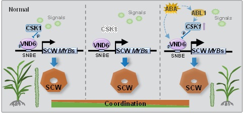 Therefore, CSK1-VND6 module acts as a "brake device" to precisely regulate the formation of secondary cell walls in rice. It was further found that CSK1 and VND6 implicate in abscisic acid-mediated stress signaling, which coordinates cell growth and SCW deposition.