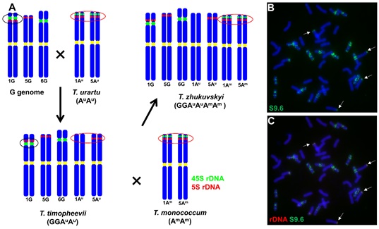In the current study, the researchers discover that T. zhukovskyi lost Au genome NORs during the first polyploidization, but retained Am genome NORs across the second polyploidization process. However, the rRNA genes from the Am genome were silenced in F1 hybrids (GAuAm) and remained inactive after chromosome doubling. Furthermore, in the case of GGAuAuDD polyploids, rRNA genes from T. timopheevii and Aegilops tauchii are both active in the F1 hybrids, and still be active in its amphiploids from low generation to the high offspring. The same mechanism, such as DNA methylation which previously acted on rDNA loci in Au genome, may also act on the newly arrived rDNA loci in Am genome, resulting in no transcriptional activity of Am in F1 hybrids (GAuAm).