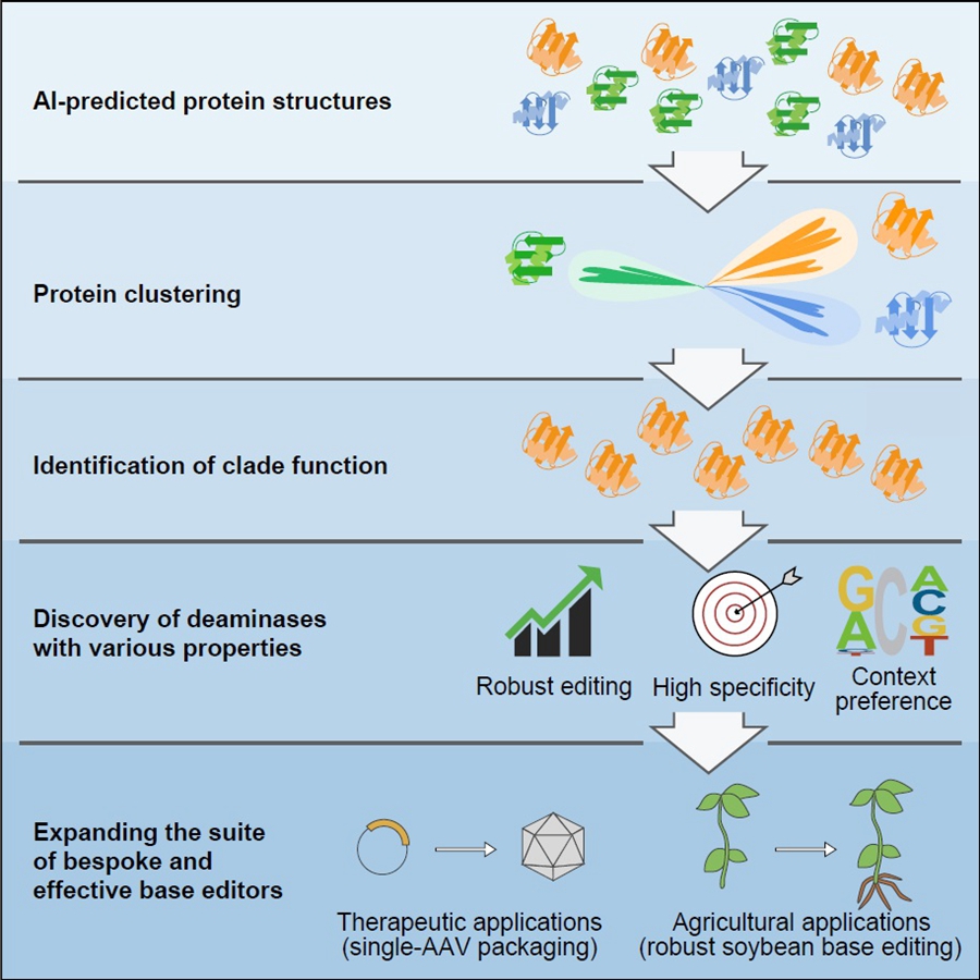 AI-assisted structural predictions and alignments establishes a new protein classification and functional mining method, further enabling the discovery of a suite of single and double-strand cytidine deaminases which show great potential as bespoke base editors for therapeutic or agricultural breeding applications. (Image by IGDB)