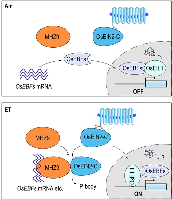 They found that MHZ9 is localized in the RNA processing body (P-body). Biochemical studies further revealed that the C-terminus and N-terminus of MHZ9 play different roles. MHZ9 C-terminus contains a glutamine-rich segment, which mediates the interaction between MHZ9 and OsEIN2-C and is also sufficient and necessary for the P-body localization of MHZ9. MHZ9 N-terminus contains a predicted domain for RNA splicing/modification, and directly binds to OsEBF1/2 and many other mRNAs.