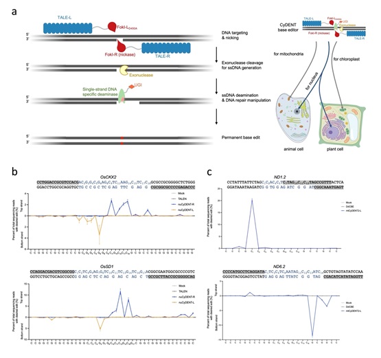 Figure: Overview of CyDENT base editing (Image by IGDB). (a) Schematic representation of the CyDENT base editing design; (b) Strand-preferred base editing in the nucleus of rice protoplasts; (c) Strand-preferred base editing in the mitochondria of HEK293T cells.