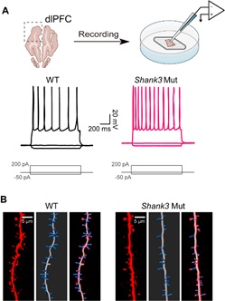 The researchers utilized Shank3 mutant dogs as model animals to investigate the electrophysiological function and morphological features of neurons in the prefrontal cortex, a brain region highly involved in social cognitive behaviors. The results revealed that, compared to wild-type dogs, the pyramidal neurons in the prefrontal cortex of mutant dogs exhibited increased excitability and reduced excitatory synaptic transmission. Furthermore, a reduced dendritic complexity, a lower dendritic spine density, and smaller postsynaptic density structures were also found in Shank3 mutant dogs. These phenotypes suggest that heterozygous Shank3 mutations are sufficient to induce morphological and functional abnormalities in cortical pyramidal neurons, potentially contributing to abnormal social behaviors in mutant dogs. Furthermore, this study demonstrated the feasibility of using canine brain slices to explore neural circuits and mechanisms of ASD.