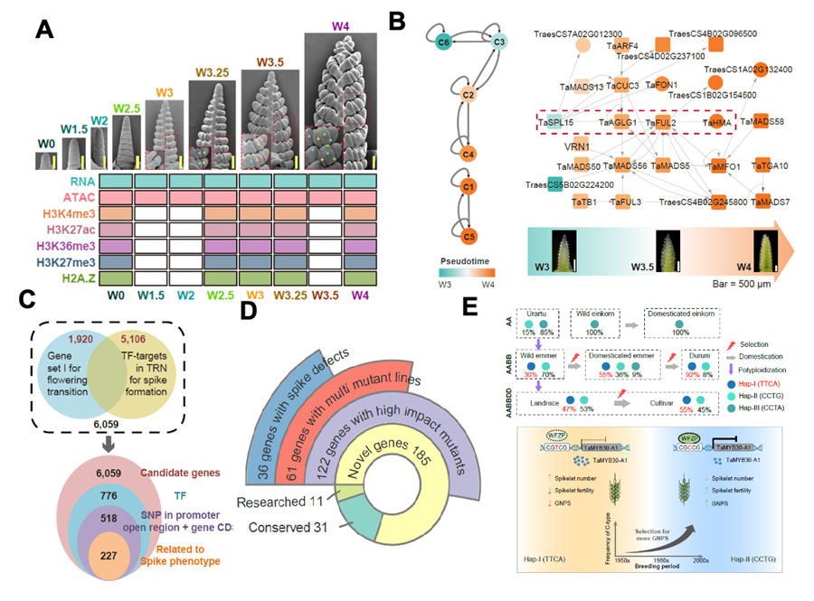 Through comprehensive sequencing of wheat spike transcriptomes, chromatin accessibility, and histone modifications across pivotal developmental stages, researchers delineated the dynamic transcriptional and epigenetic landscape of wheat spike maturation, culminating in the construction of a transcriptional regulatory network (TRN). By merging multidimensional omics with population genetics, they pinpointed 227 putative regulatory factors influencing spike development, with 42 already implicated in wheat or rice spike formation. Phenotypic screening of 61 novel genes via the KN9204 mutant library unveiled 36 mutations, including TaMYC2-A1, TaMYB30-A1, and TaWRKY37-A1, altering flowering time or spike morphology. Functional characterization of TaMYB30-A1 underscored the TRN’s efficacy in deciphering gene functionality and its practical utility in wheat breeding initiatives.