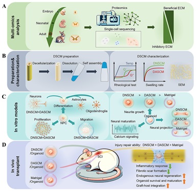 Subsequently, NPCs and spinal organoids were integrated into the spinal cord ECM for SCI repair. Results showed that neonatal ECM weakened the inhibitory microenvironment after SCI and promoted enhanced migration and integration of NPCs into the host spinal cord tissue.