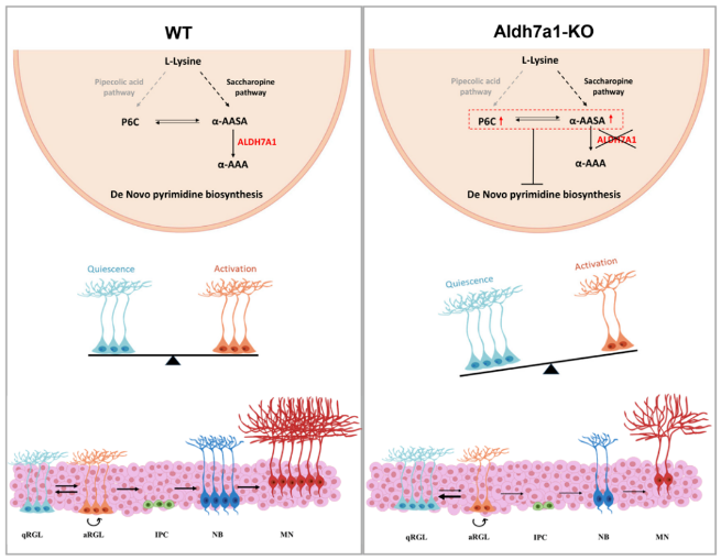 Therefore, ALDH7A1 deficiency leads to the accumulation of toxic metabolites in lysine metabolism, impairing de novo pyrimidine synthesis, thereby inhibiting defects in hippocampal neurogenesis and cognitive impairment, while pyrimidine administration can rescue defects in adult neurogenesis and cognitive impairment.