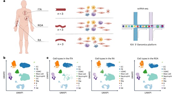a, Schematic of overall study design. b, UMAP plot of the integrated donor artery datasets, with cells colored according to the major cell types. c, UMAP plots showing the composition and similarities of major cell types in each donor arteries. (Image by IGDB)