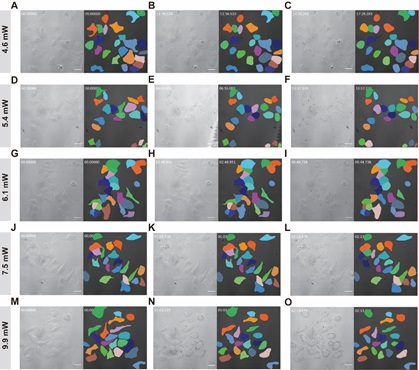 Typical instance segmentation results obtained by the Cellpose algorithm at different time points and laser intensities ranging from 6% (4.6 mW) to 12.5% (9.9 mW). The white lettering in the upper left corner of the image represents the relative time point, with a time format of mm:ss.sss: (A–C) 4.6 mW, (D–F) 5.4 mW, (G–I) 6.1 mW, (J–L) 7.5 mW and (M–O) 9.9 mW, respectively. Scale bars: 30 μm. (Image by Institute of Genetics and Developmental Biology)