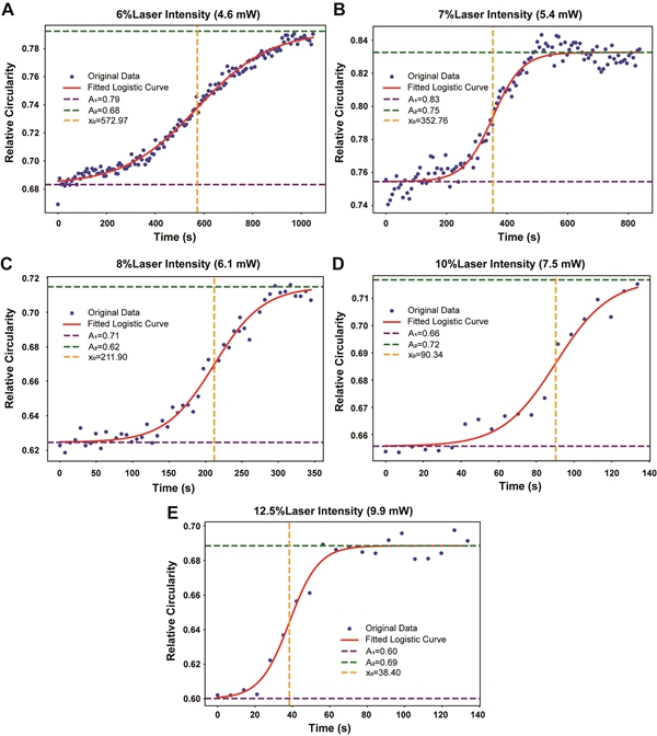 Typical dynamic profiles of cellular circularity in different groups with different PDT laser intensities. The data points, represented by blue dots, represent the observed experimental measurements of cell circularity at different time intervals. The orange curve represents the fitted logistic growth model superimposed on these data points. This model is characterized by an ‘S-shaped’ growth pattern: an initial slow growth phase, followed by a rapid exponential increase and a final plateau at a maximum limit. The results obtained under laser intensities of 4.6 mW, 5.4 mW, 6.1 mW, 7.5 mW, and 9.9 mW, respectively, are as follows: A-E. (Image by Institute of Genetics and Developmental Biology)