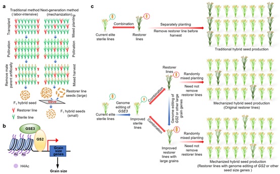 a, The traditional labor-intensive (left) and the next-generation mechanized (right) production of F1 hybrid seeds are compared. In a traditional hybrid seed production process, the male sterile line needs to be grown near the restorer line in the alternative row for pollination (left). Before large-scale mechanized harvesting of hybrid seeds, the restorer line needs to be removed from the field by hand labor. The next-generation approach for F1 hybrid seed production is to plant the sterile line in the mixture with the restorer line, harvest mixed seeds of the male sterile line and the restorer line, and mechanically separate hybrid seeds by the sieve according to the seed size differences between the male sterile line and the restorer line (right). b, A proposed model for the GSE3-GS2 regulatory module in controlling grain size. The GSE3 positively regulates grain size. GS2 directly binds to the promoter region of grain size genes. GS2 recruits GSE3 to co-regulate the common target genes. This co-regulation is achieved by influencing the histone H4 acetylation of the promoter region, leading to the regulation of grain size. c, Mechanized hybrid seed production can be achieved for some elite hybrid rice varieties only by editing the GSE3 gene in male sterile lines when the grain thickness difference between the restorer lines and the male sterile lines was relatively large. For other elite hybrid rice varieties, mechanized hybrid seed production can be achieved by editing the GSE3 gene in male sterile lines and the GS2 gene for large grains or other large grain size genes in the restorer lines.