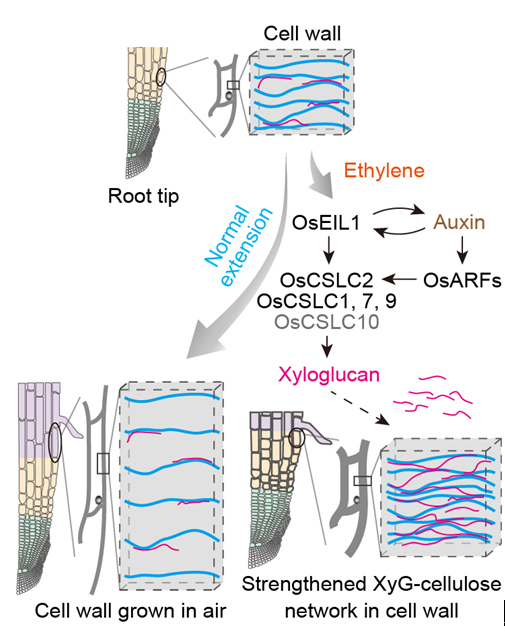 TIME: 12 Jul 2024Research teams led by Prof. ZHANG Jinsong and Prof. ZHOU Yihua from the Institute of Genetics and Developmental Biology of the Chinese Academy of Sciences revealed that ethylene inhibition of root growth depends on CELLULOSE SYNTHASE-LIKE C proteins-mediated xyloglucan (XyG) induction in cell wall of rice. The study was published in The Plant Cell on June 29, 2024 (https://doi.org/10.1093/plcell/koae195).Phytohormone ethylene participates in multiple aspects of plant. How does ethylene regulate plant growth? Although the processes of ethylene signaling pathway and signaling regulation are currently almost clear, the understanding of where ethylene signal is outputted downstream for growth regulation is still limited, especially in crops, such as rice.Plant cells are encased in a cell wall which determines the morphogenesis of plant cells and the plastic growth for plant. The cell wall consists of macromolecular polysaccharides, highly glycosylated proteins, and lignin, forming a complex and dynamic polysaccharide network. Is there a relevance between ethylene regulation of plant growth and cell wall establishment?The changes in cell shape, cell wall thickness, cell wall components and gene expression drew the attention of the researchers in cell wall synthesis during ethylene inhibition of root growth. The overexpression, mutant, and genetics analyses supported that OsCSLC2-mediated and ETHYLENE-INSENSITIVE3-LIKE1 (OsEIL1)-regulated XyG accumulation in the epidermal cell walls of root elongation and differentiation zone is indispensable for the ethylene inhibition. After several experiments, the researchers finally observed a stronger phenotype of root ethylene response using higher-order mutants of CSLC gene family. Another issue regarding the interaction between XyG and cellulose remains a challenging aspect that requires further research.Together, this published study revealed that ethylene induces XyG and cellulose accumulation in root cell walls by upregulating the expression of OsCSLC1, 2, 7, 9, 10 and CELLULOSE SYNTHASE A3, 4, 7, 9 in an OsEIL1 and auxin pathway-dependent manner.These findings link plant hormone signaling with cell wall establishment, broadening the understanding of root plastic growth in rice and other crops.