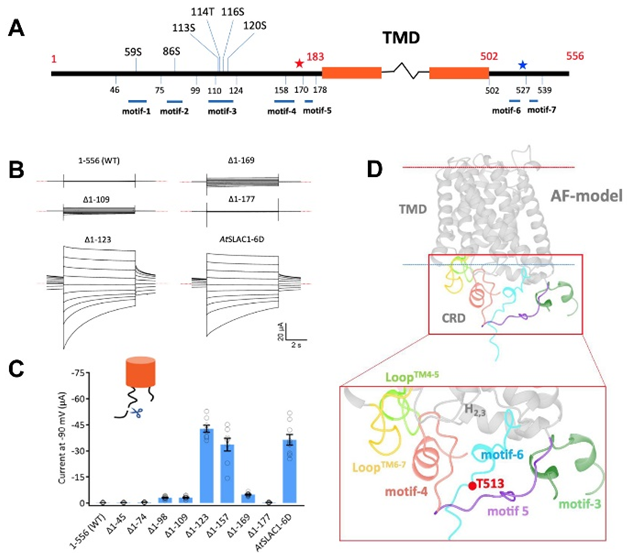 In this study, they showed that SLAC1 channels are maintained in an auto-inhibited state by their N-termini, which, when removed, lead to kinase-independent activation. AlphaFold modeling showed that the flexible N- and C-termini form a cytosolic regulatory domain (CRD) that interacts with the pore-forming TMD to maintain the auto-inhibited state. In response to environmental cues, plants phosphorylate SLAC1, releasing it from auto-inhibition and allowing activation.