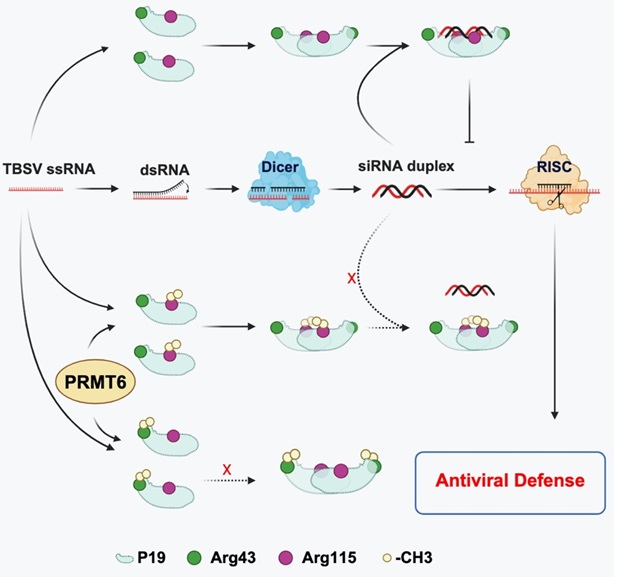 Tomato bush stunt virus (TBSV)-encoded P19 is a well-studied VSR that promotes viral systemic movement by binding to the siRNA duplex. A previous study of Professor CAO Xiaofeng's team found that PRMT6 overexpression could restore the phenotype of overexpressing P19 in Arabidopsis, while PRMT6 knockout exacerbates the phenotype of P19 overexpression. This suggests that PRMT6 in plants may play a role in antiviral responses.