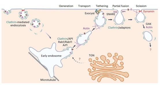 To characterize the molecular components and properties of the clathrin-associated recycling carriers, the authors conducted TIRF microscopy-based imaging screening. They identified a series of proteins recruited at various stages throughout the generation, approach, fusion, and retrieval of the clathrin-associated recycling carriers. Furthermore, they demonstrated that these carriers are generated from a subdomain of early endosomes that lack the retrieval complexes.
