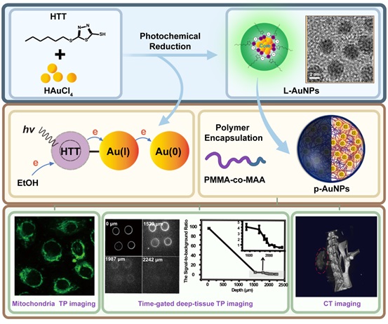 In addition, these prepared p-AuNPs were found to have excellent photostability and efficient mitochondrial targeting. High-quality mitochondria-targeted two-photon excited luminescence (TPEL) imaging, time-gated delayed imaging of deep tissues and in vivo computed tomography (CT) imaging have been successfully achieved based on these above p-AuNPs.