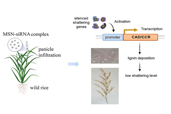 This research provides a novel strategy for improving seed shattering in wild rice and may make an important contribution to improving rice yield and stability. Moreover, the use of nano-carriers for gene silencing avoids the defects of traditional genetic engineering, does not cause permanent changes to plant genomes, and meets the requirements for the safety of genetically modified crops.