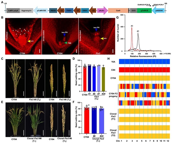 In addition, the Fix3 lines exhibited agronomic traits similar to those of wild-type hybrid rice, including completely normal seed-setting rates and a high clonal seed efficiency, with some lines reaching a cloning efficiency of approximately 21.7%. Further phenotypic analysis indicated that the progeny of these clonal plants showed phenotypic characteristics highly similar to those of the wild-type hybrid rice and maintained normal seed-setting rates.