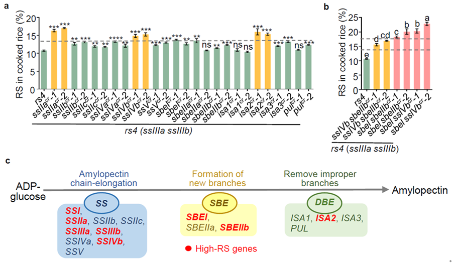 In this study, the researchers used genome editing to conduct a systematic genetic analysis of 14 amylopectin biosynthetic genes in the ssIIIa ssIIIb double mutant background. The mutation of specific amylopectin biosynthetic genes further increased the RS content in the ssIIIa ssIIIb background. Moreover, they found that the quadruple mutants of sbeI sbeIIb ssIIIa ssIIIb and sbeI ssIVb ssIIIa ssIIIb could boost RS levels to more than 18%.