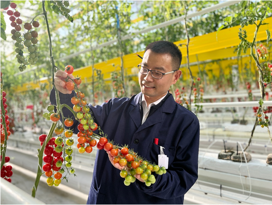 IGDB's Professor XU Cao inspects the climate-smart tomatoes (Image by IGDB).