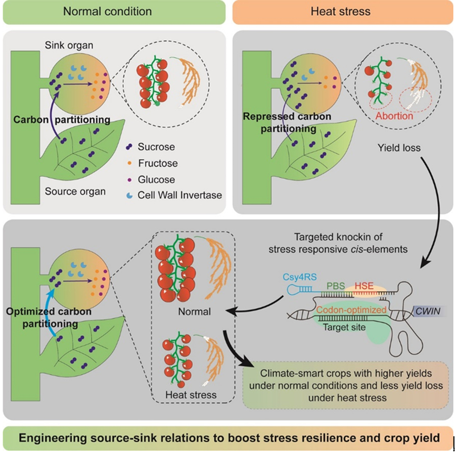 In their new study, Prof. XU Cao and his team developed a strategy based on climate-responsive optimization of carbon partitioning to sinks (CROCS) by rationally manipulating the expression of CWIN genes in fruit and cereal crops. They precisely knocked-in a 10-bp heat-shock element (HSE) into promoters of CWIN genes in elite rice and tomato cultivars, using self-developed high-efficiency, prime-editing tools. HSE insertion endows CWINs with heat-responsive upregulation in both controlled and field environments to enhance carbon partitioning to rice grains and tomato fruits.
