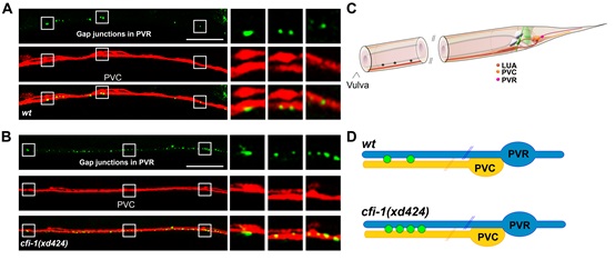 Figure: Gap junction connections between PVC and PVR neurons in wild type and cfi-1mutant animals. (Image by IGDB)