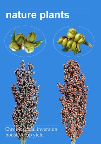 Figure. In this issue of Nature Plants, Zhang et al. found a substantial chromosomal inversion in the DG1 promoter upregulates its expression. It gives rise to a double-grain spikelet trait remarkably augmenting the grain number and yield in sorghum and illustrating the pivotal role of genomic structural variation in plant evolution. (Image by IGDB)