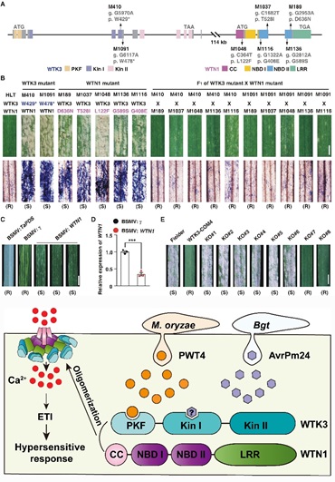 To address these questions, the researchers screened ethyl methanesulfonate (EMS)-induced susceptible mutants of Pm24 (WTK3) and identified WTN1 as a pivotal component of the WTK3-mediated disease resistance pathway. Genetic analyses and genome editing demonstrated that WTN1 is essential for WTK3-mediated immunity against wheat powdery mildew. The WTK3-WTN1 pair operates via a sensor-executor cooperative model, with WTK3 not only conferring resistance to powdery mildew but also recognizing the wheat blast effector PWT4, thus extending its resistance potential.